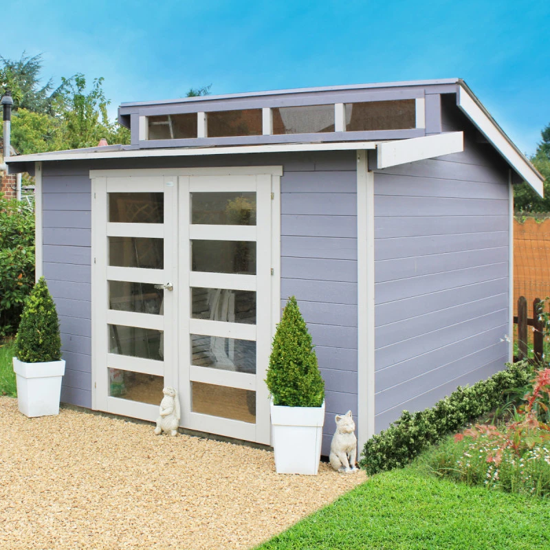 L’abri en pin massif certifié Milano fait la part belle à la lumière. Sa toiture en gradin est munie d’une ouverture vitrée, et grâce à une double porte à panneaux vitrés vous profitez d’un environnement lumineux et d’une architecture originale. La porte est équipée à l’extérieur d’une serrure à clé et d’un bouton de verrouillage anti-enfermement à l’intérieur, pouvant être actionné par la clé à tout moment. Un seuil bas en aluminium protège durablement le bas du châssis de la porte lors de passages répétés, spécialement lors du rangement d’outils roulants, tels que brouette, tondeuse, et autres.