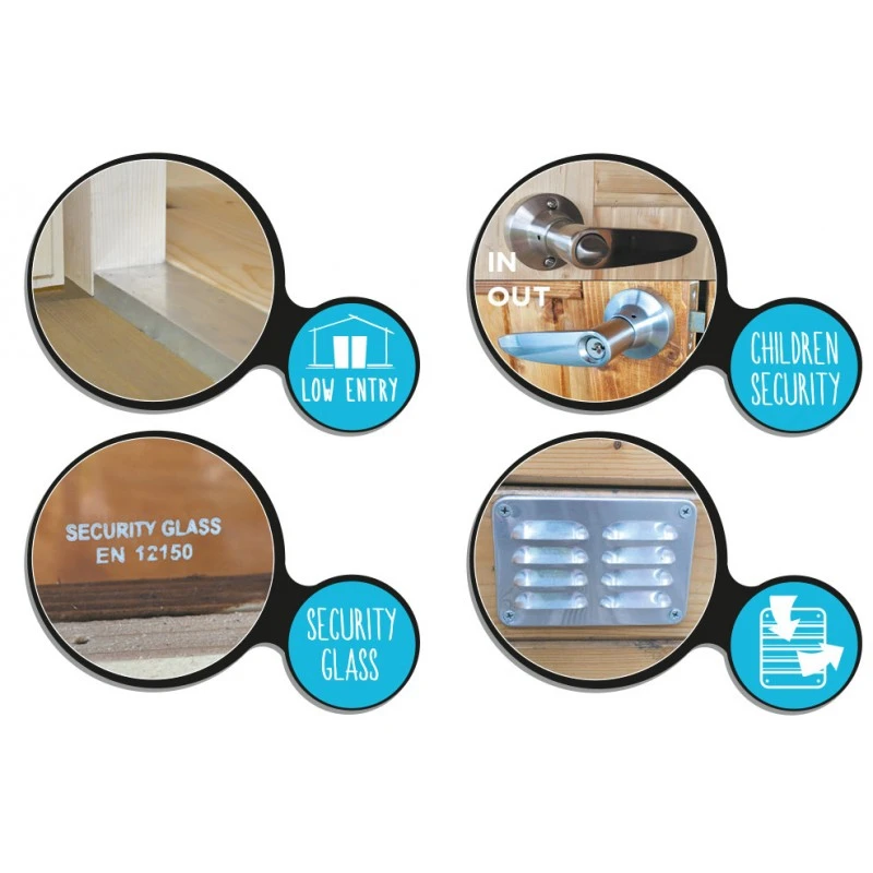 Les finitions sont haut de gamme : seuil en aluminium pour un passage aisé, vitrage n verre sécurit, poignée avec serrure et sécurité enfants, grilles d’aération en aluminium.