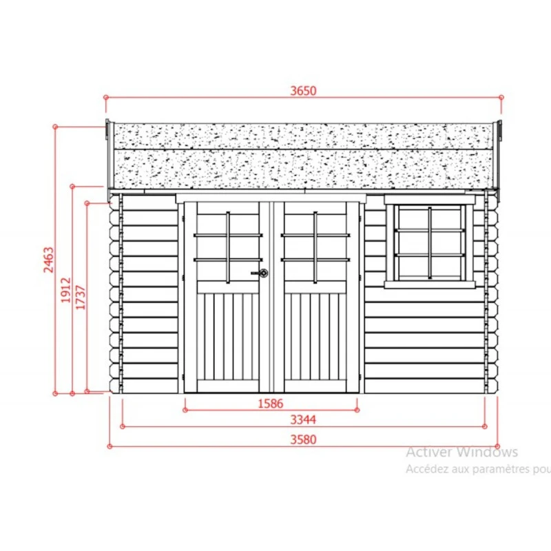 Avec sa double porte en façade et sa fenêtre oscillo-battante, l’abri de jardin en bois Arles est une maisonnette au cachet alpin qui pourra abriter votre outillage de jardin, servir de cabane pour vos enfants ou de pièce supplémentaire pour abriter un atelier. La façade est large de 365cm avec une profondeur de 238cm, pour une surface extérieure de 8,52m². Les parois hautes de 191cm supportent une toiture à double pente dont la hauteur faîtière est de 246cm. Vous pourrez vous y déplacer en tout confort et ranger des objets volumineux.