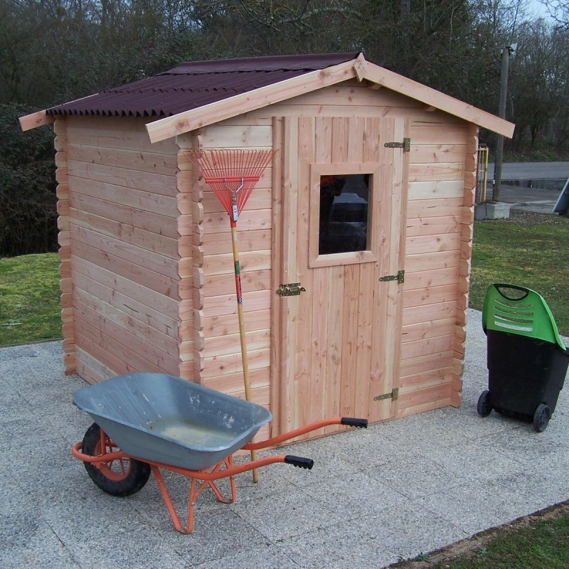 • Abri en bois de belle finition aspect brun-rosé, naturellement durable ne nécessitant pas de traitement chimique