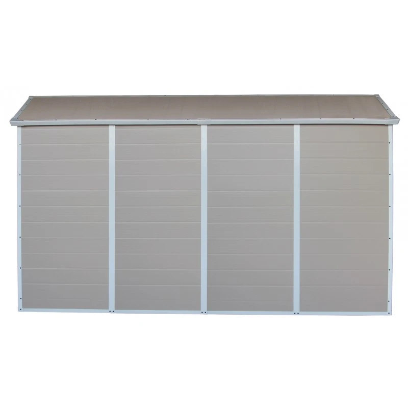 Le coloris beige des panneaux s’intègre harmonieusement dans tout type d’aménagement extérieur, et les bandes blanches des raccords ou entourant la porte offrent un contraste élégant. Située au dessus de la double porte, une grille de ventilation assure un renouvellement de l’air par convection, pour une protection optimale de votre outillage. Sur le côté, une fenêtre fixe en polycarbonate apporte un éclairage naturel pendant la journée, vous dispensant d’amener un éclairage électrique. Cet abri est certifié CE, REACH et RoHS et dispose d’une garantie de 10 ans.