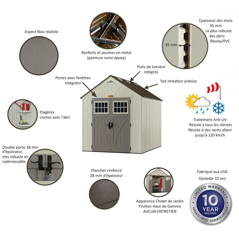 Ne nécessitant aucun entretien particulier, l’abri de jardin Woodgrain Suncast est le produit qui vous accompagnera de nombreuses années. Sa garantie de 10 ans est une preuve de la qualité de ce produit.