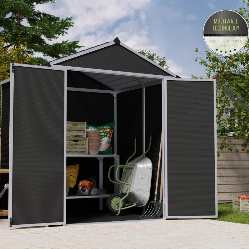 L’abri de jardin Rubicon est un produit de qualité qui a été conçu pour un montage simple et rapide en 5 étapes, en suivant la notice détaillée pas à pas. La structure en aluminium est renforcée au niveau des montants de la toiture et à tous les points de jonction importants. Les parois de 10mm en polycarbonate sont à double épaisseur, pour une solidité à toute épreuve et une meilleure isolation.