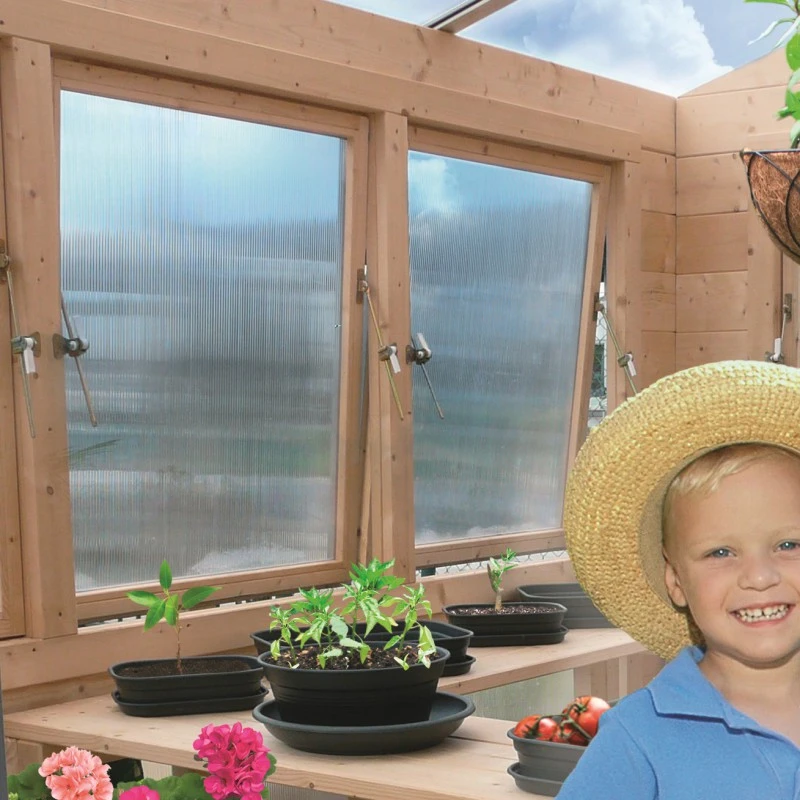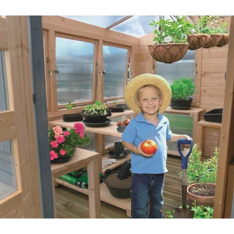 L’abri serre est extrêmement bien pensé. Il est équipé de tables de préparation en bois, à l’intérieur, pour le stockage de vos plantes et pour vous faciliter le travail dans la serre.