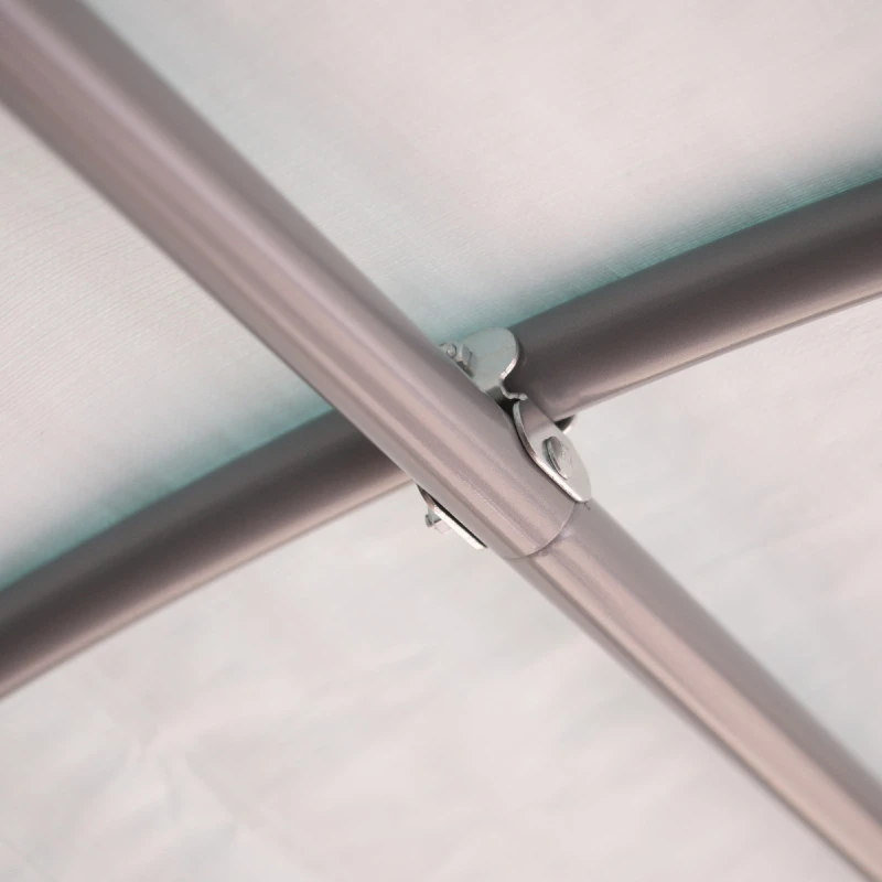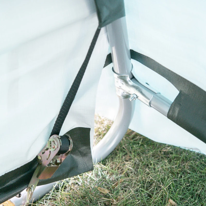 La toile est maintenue en place solidement grâce aux sangles d’arrimage à cliquet qui se fixent sur la structure. Pour une tension optimale de la toile, le système de traverses coulissantes se verrouille et positionne la structure pour qu’elle demeure parfaitement ajustée à la bâche. Cet abri démontable s’installe rapidement et ne requiert aucun outillage spécifique. Il peut être utilisé de manière saisonnière ou tout au long de l’année. L’installation doit se faire sur un sol relativement nivelé avec les 4 pieds d’ancrage fournis.