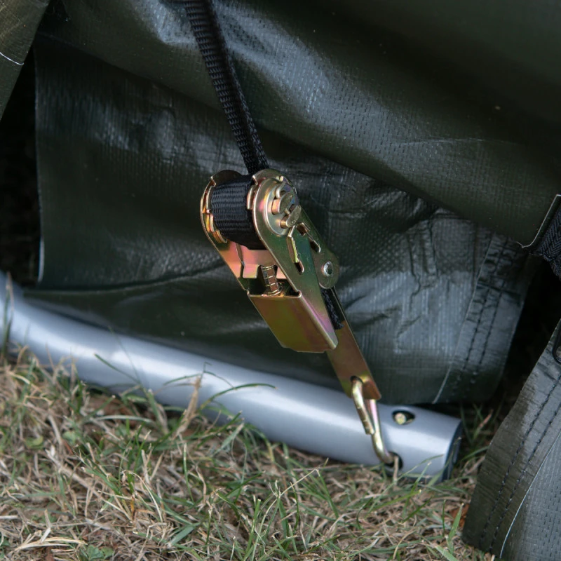 • Sangles d’arrimage à cliquet et traverses coulissantes pour une tension optimale de la toile
