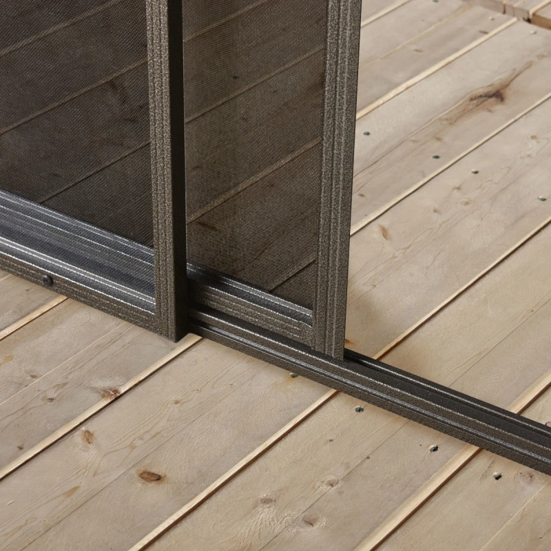 Chaque côté du pavillon comprend une double porte moustiquaire coulissante, de dimensions 140x210cm pour les largeurs et 205x210cm pour les longueurs. L’emprise de la toiture est de 362x427cm avec une hauteur faîtière de 296cm. Grâce à la toiture en polycarbonate de 8mm d’épaisseur, vous pourrez cultiver des plantes sensibles et profiter des rayons du soleil pour vous réchauffer aux entre saisons. Et lorsque le soleil est trop fort, un store rétractable vous assurera un ombrage rafraichissant. Le store se compose de 2 parties qui se joignent à la main au moyen d’un clip, en toute simplicité. Le montage doit se faire sur une surface plane, il se réalise facilement au moyen d’un outillage standard à 2 personnes en environ 5 à 6 heures.