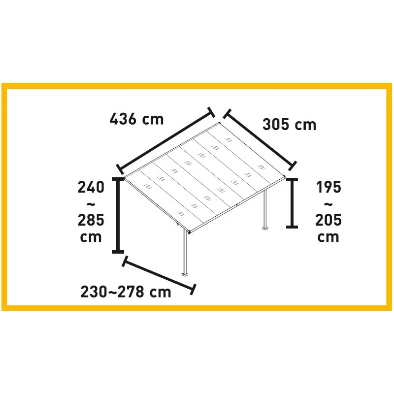 Outre l’excellente facture de cette pergola, réalisée en aluminium, donc anti-rouille, pour la structure, et en polycarbonate épais de 6mm traités anti-UV pour la couverture, elle est aussi très pratique puisque vous pourrez ajuster le positionnement des pieds et ainsi contourner certains obstacles gênants. En effet, les pieds sont à la fois ajustables dans la profondeur et dans la largeur. La hauteur contre le mur est elle aussi réglable en fonction de vos besoins.