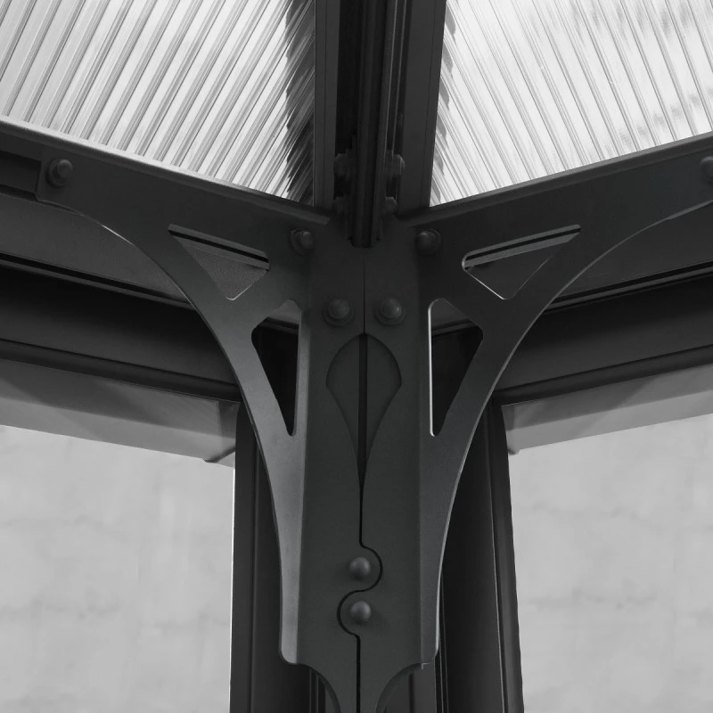 Le cadre et les poteaux en aluminium ultra-résistant sont recouverts d’une peinture par poudrage gris anthracite, ce qui donne à la pergola un look contemporain très élégant. A la jonction de la toiture, des éléments de renforts en acier galvanisé découpés par laser ajoutent également une touche art déco, et apporte une grande stabilité structurelle à l’ensemble. Cette pergola est conçue pour faire face à des vents de 90km/h ou à une charge de neige maximale de 100kg/m², et pour les régions au climat rude, un ancrage supplémentaire permet d’améliorer encore sa solidité.