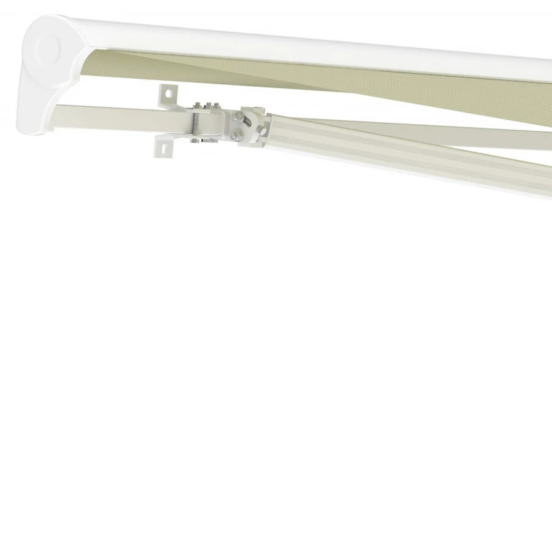 Le bras articulé, véritable colonne vertébrale du store extérieur rétractable est conçu en acier galvanisé très résistant lui permettant de résister aux multiples agressions extérieures. La barre frontale, le rouleau ainsi que les supports sont quant à eux en aluminium. L’ensemble des éléments sont recouverts d’une peinture blanche RAL9010 pour une association parfaite avec la couleur beige de la toile.