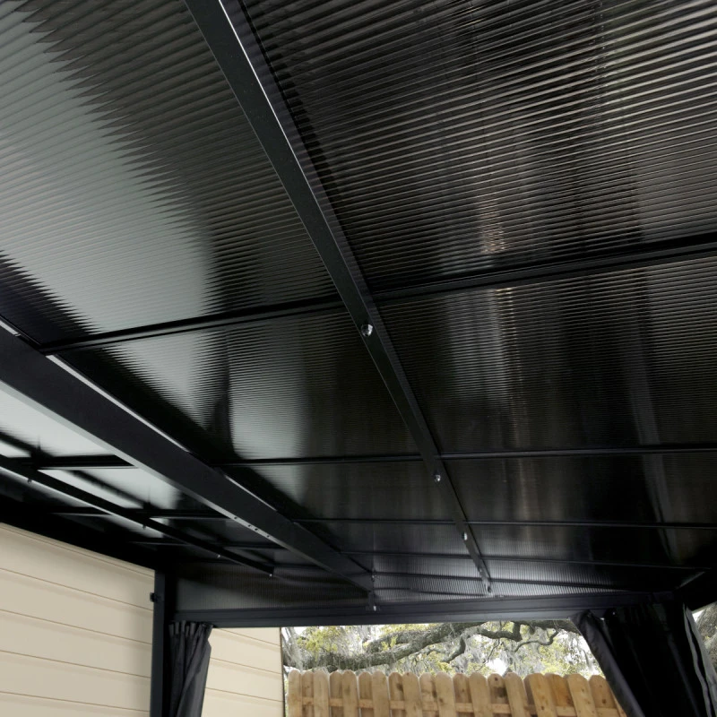 La toiture est constituée de panneaux en polycarbonate à double paroi de 8mm d’épaisseur teintés, et celle-ci peut soutenir une charge de neige de 125kg/m². Il est cependant conseillé d’évacuer la neige pour éviter une accumulation excessive. Les panneaux sont traités contre le rayonnement UV, et la toiture est inclinée pour une évacuation optimale de l’eau de pluie.