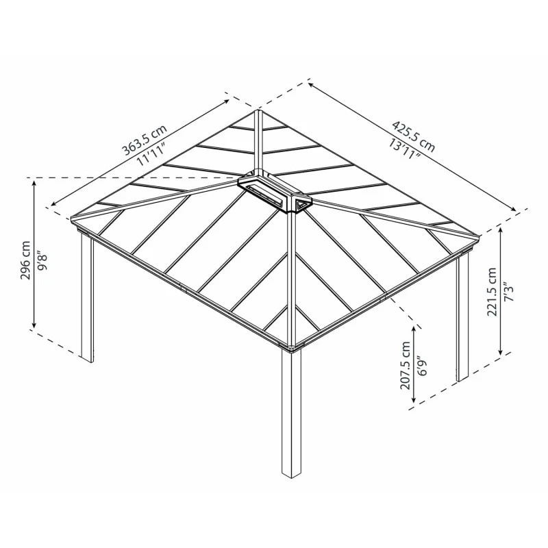 Les panneaux sur le toit de cette tonnelle de jardin Dallas de Canopia by Palram sont conçus en polycarbonate de 6mm à double paroi. Incassables et extrêmement durables, ils résistent aux impacts et aux chocs. Traités anti-UV et d’un gris opaque, les panneaux de toit bloquent les rayons nocifs du soleil et assurent un ombrage parfait avec leur transmission lumineuse de 2%. Pas besoin de les retirer pendant la saison hivernale.